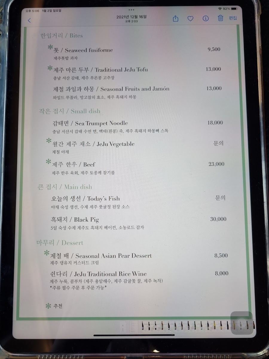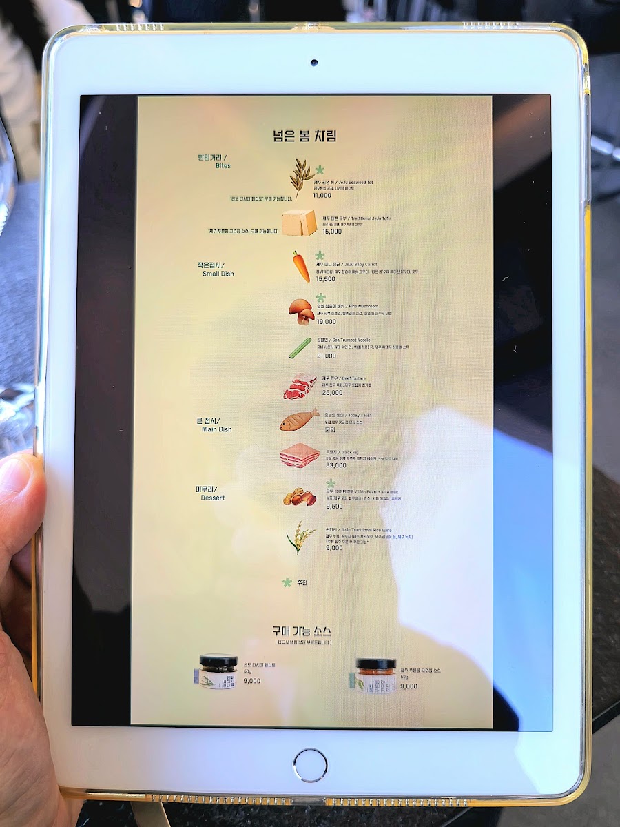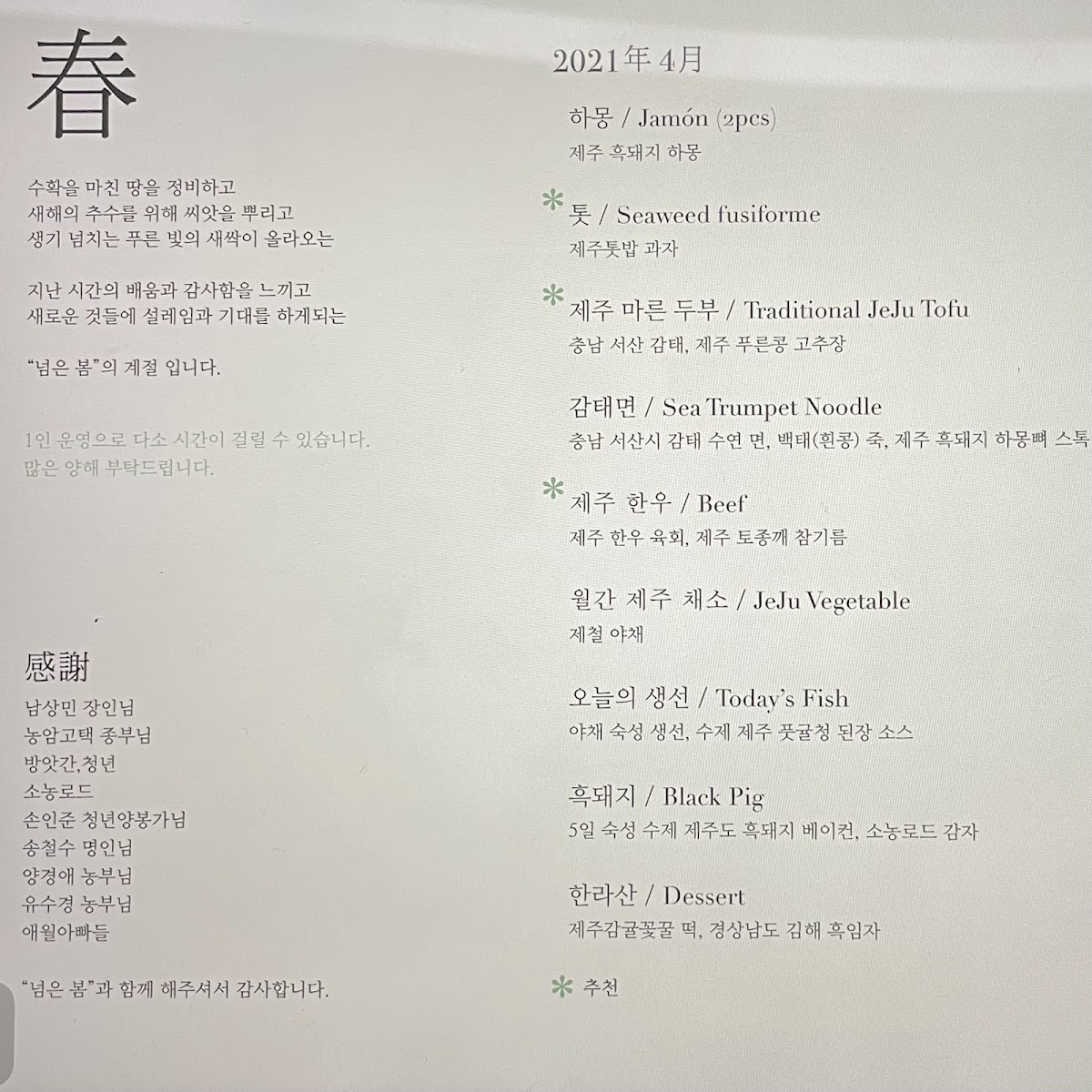 The menu at Last Spring Jeju offers a delightful and authentic taste of Jeju, with dishes that beautifully showcase local flavors and ingredients. Among the highlights is the 톳김치, a tangy and refreshing seaweed kimchi that brings a unique depth of flavor to the table. Another standout is the 제주마른두부, a crispy yet tender dried tofu from Jeju, perfectly paired with the restaurant’s signature sauces. Each dish is thoughtfully prepared, emphasizing the fresh, natural ingredients that are so abundant on the island. The variety of textures and flavors, from the umami richness of the tofu to the bright, crisp notes of the seaweed, demonstrates the chef's commitment to showcasing Jeju's culinary heritage. Whether you’re a local or a visitor, Last Spring Jeju offers a memorable dining experience that highlights the best of the island’s flavors, making it a must-visit destination for anyone exploring Jeju's gastronomic scene.